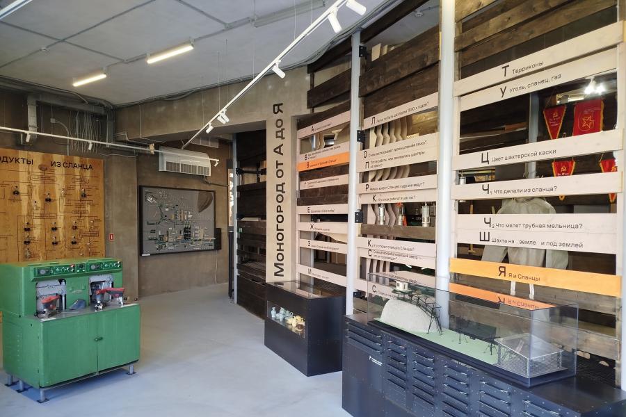 Пространство музея состоит из трех частей. Первый зал – своеобразный «музейный чилаут», тут можно познакомиться с основной идеей музея, подняться на балкон с открытой библиотекой и местами для отдыха, поговорить с друзьями, полюбоваться уникальными музейными предметами и видами из окон. Второй зал строится вокруг центральной инсталляции «Шахта», проходя через которую посетитель слышит голоса шахтеров, и сегодня живущих в Сланцах, видит предметы шахтерского быта, а затем попадает в необычную «Лабораторию истории», где фотографии, документы, произведения изобразительного искусства и быта становятся объектами самостоятельного исследования. Зона «Моногород от А до Я» вовлекает посетителя в необычный музейный квест по поиску ответов на вопросы: Чем обедали шахтеры? Что делали из сланца? Кем работали в шахтах женщины? Третий зал предназначен для временных выставок.
